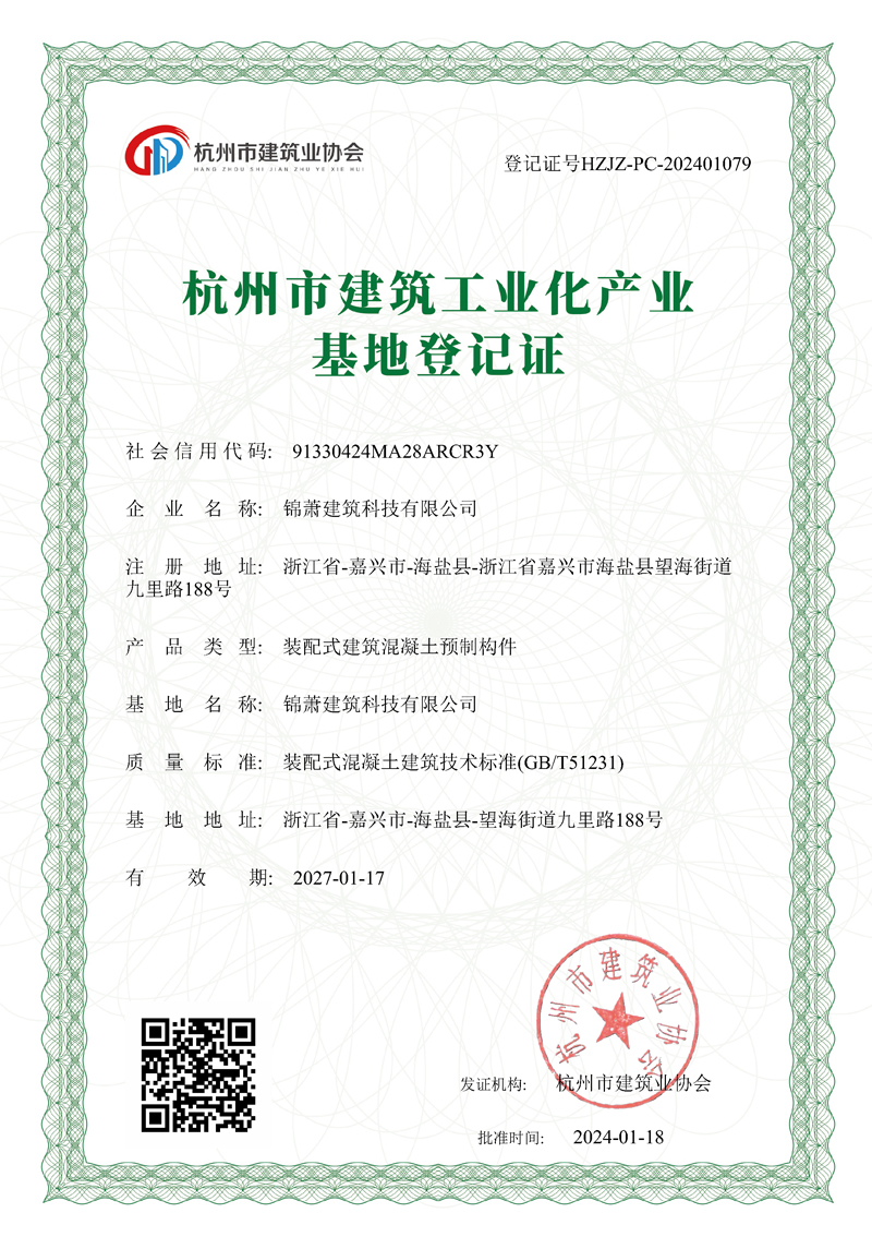 杭州市建筑工业化产业基地登记证