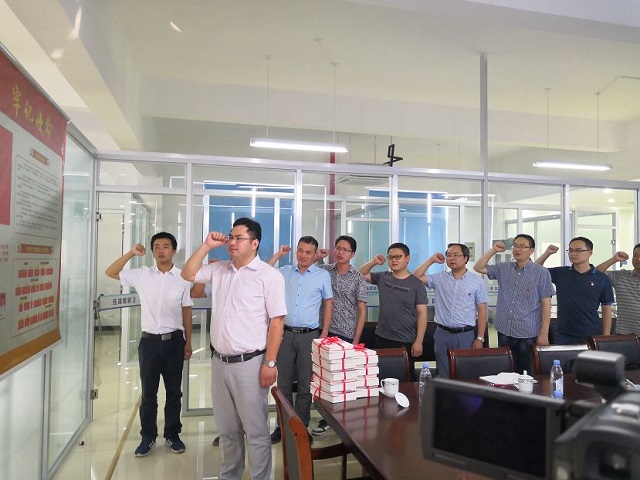 随后,公司党支部书记、副总经理沈秋良带领全体党员重温入党誓词,街道党委委员缪李伟向公司党支部全体党员赠送党徽和十九大学习资料,鼓励全体党员大力弘扬“红船精神”,进一步引导党员同志不忘初心,牢记使命,砥砺前行。