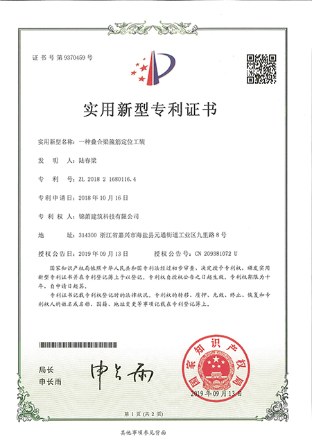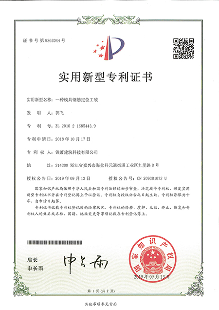专利证书--一种模具钢筋定位工装